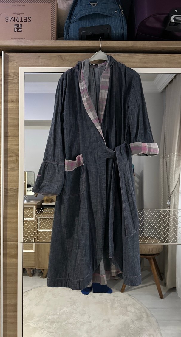 Bu uzun gri kap, gevşek kesim ve batik desenlidir. Bohem tarzı, yakada, manşetlerde ve ceplerde kontrast ekose detayları vardır. ️