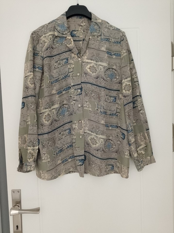 Gri renkte, bohem tarzda, uzun kollu ve düğmeli, yakalı gömlek. Retro görünümlü batik desenlidir.