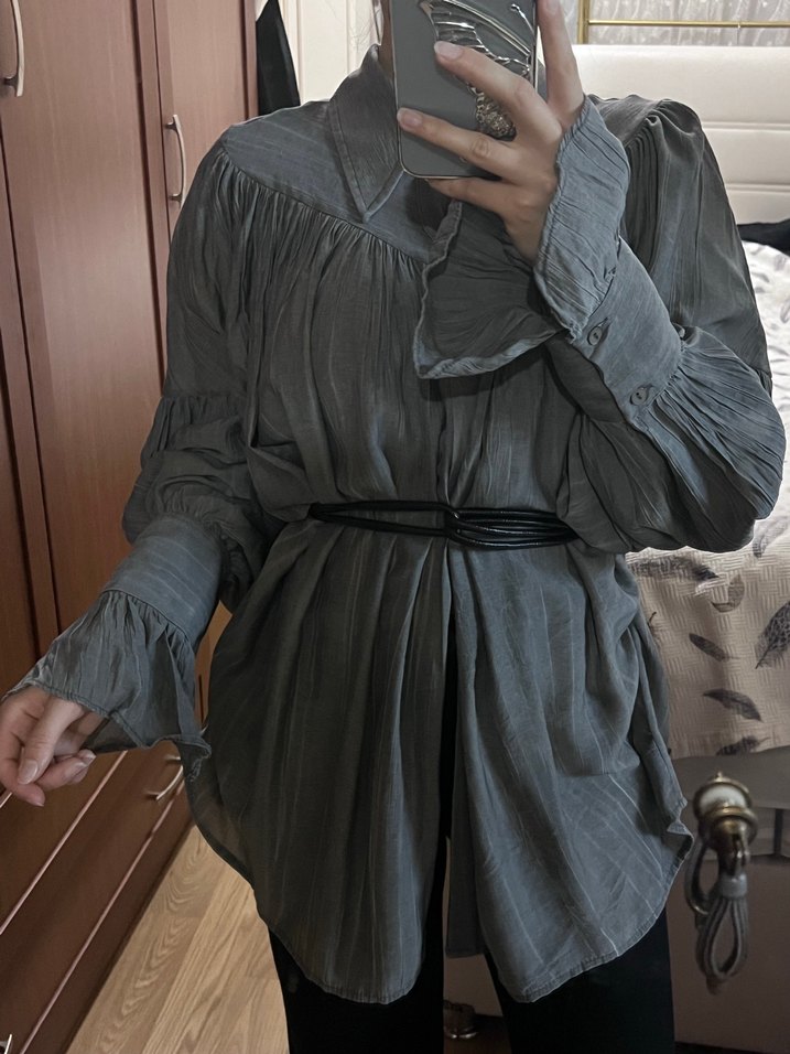 Gri gömlek, yüksek yakalı ve uzun kollu, bol kesimdir. bohem Paris tarzını yansıtır. Günlük kullanıma uygundur.