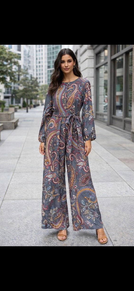 Kadınlar için bol kesim, uzun kollu ve yuvarlak yakalı tulum. Gri paisley desenli ipeksi kumaştan, kuşaklı ve bohem tarzda, günlük kullanıma uygun. yandan fermuarlı.
