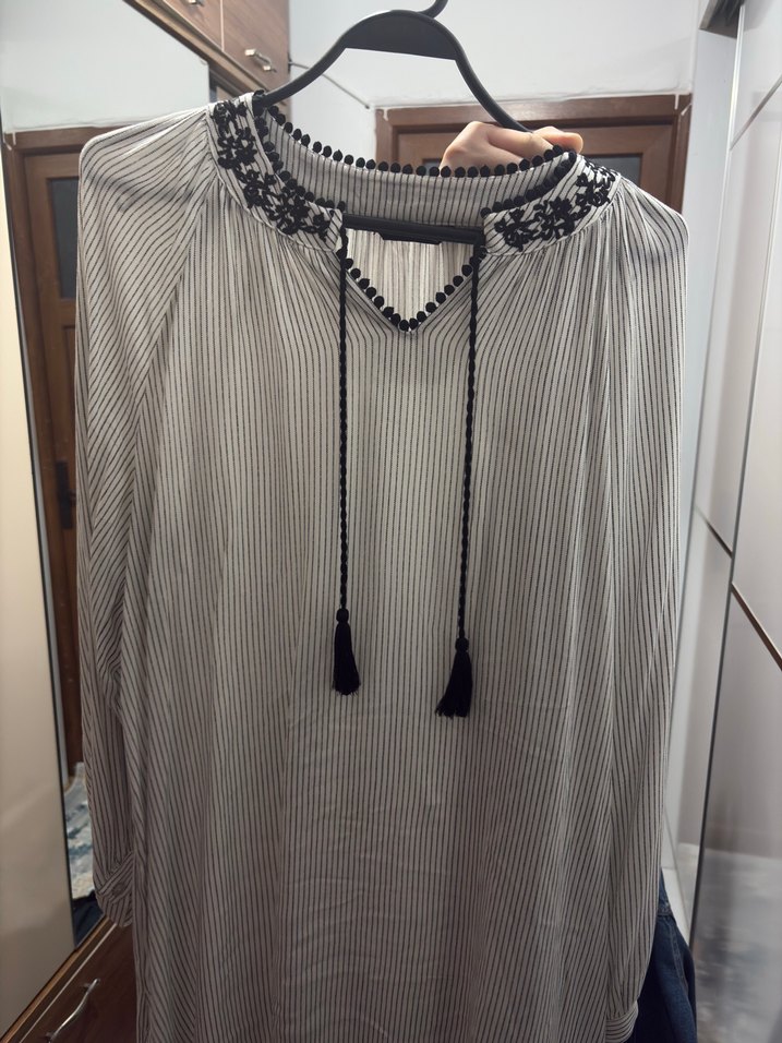 Gri renkli, uzun kollu, V yaka ve püsküllü bağcık detaylı bohem tarzda rahat kesim bir bluz. Çizgili tekstil kumaştan ve nakışlıdır, günlük kullanım için uygundur.