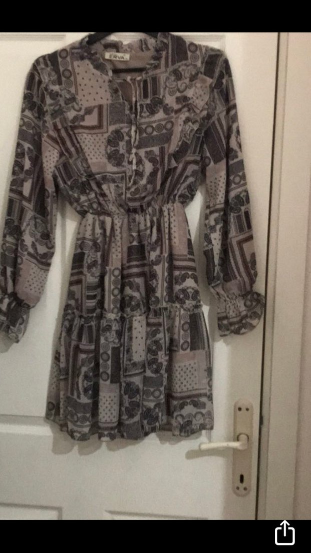 Gri desenli, uzun kollu ve bol kesim elbise, V yakalı ve fırfırlı detaylara sahip, yumuşak sentetik kumaştan üretilmiştir. Günlük kullanım için uygundur. Boyu82 cm'dir