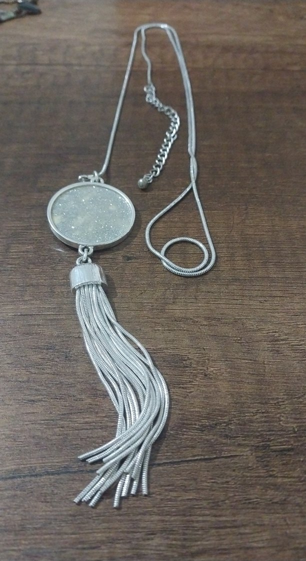 Gri renkli, bohem tarzda uzun kolyede yılan deseni ve püskül detayı bulunur, günlük kullanım için uygundur.