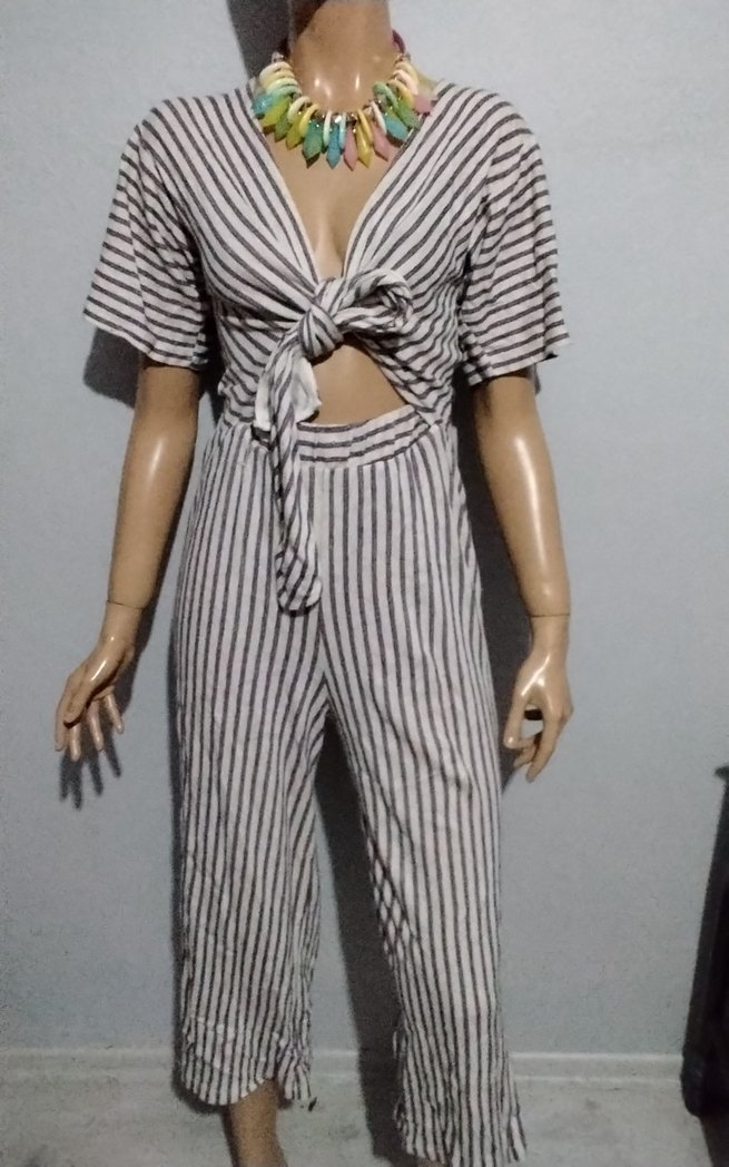 Gri renkte, bohem tarzda zebra desenli, V yaka ve pile detaylı uzun tulum. Strappy kollu ve regular fit modeldir.