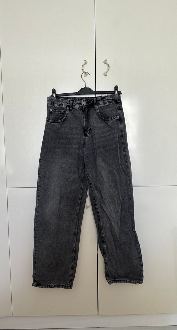 Gri renkli, kot kumaştan yapılmış, baggy pantolon. M beden. Yeni yıkandığı için ütüsüz başka hiçbir kusuru yok. Unisex. Marka temsili.