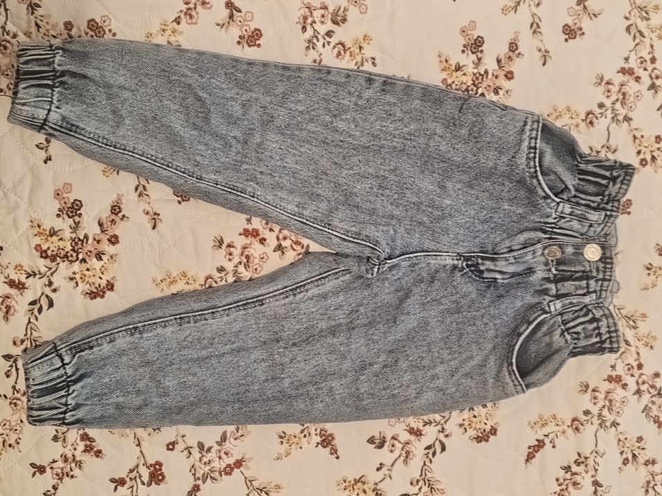 Mavi denim kumaştan, bol kesim çocuk kot pantolon. Beli ve paçası lastikli desensiz ve günlük sokak stili için uygun. 5yaş