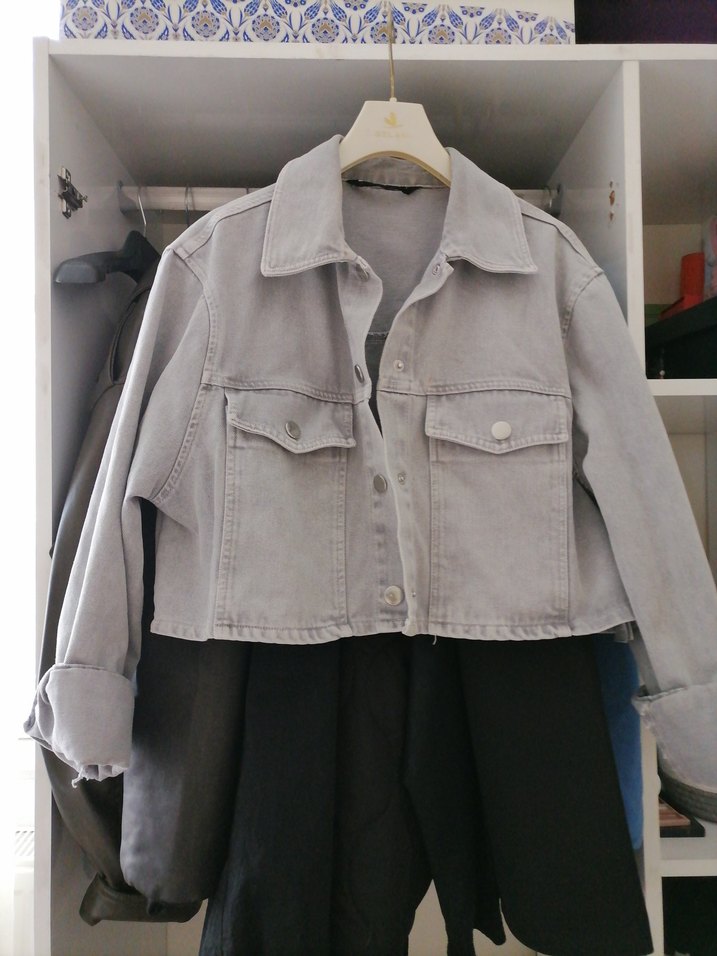 Gri renkli, bol kesim, düğmeli, uzun kollu denim ceket. Notlu yaka ve günlük kullanıma uygun rahat tarz sunar.