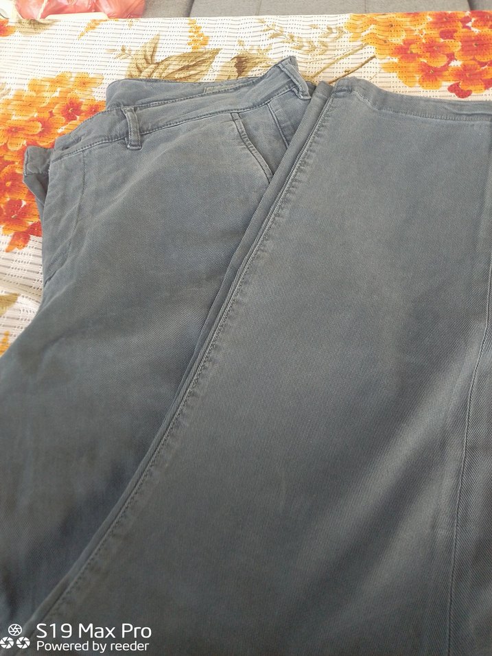 Gri renk, bol kesim, düğmeli denim erkek pantolon, normal boyda ve günlük kullanıma uygun rahat stilde.