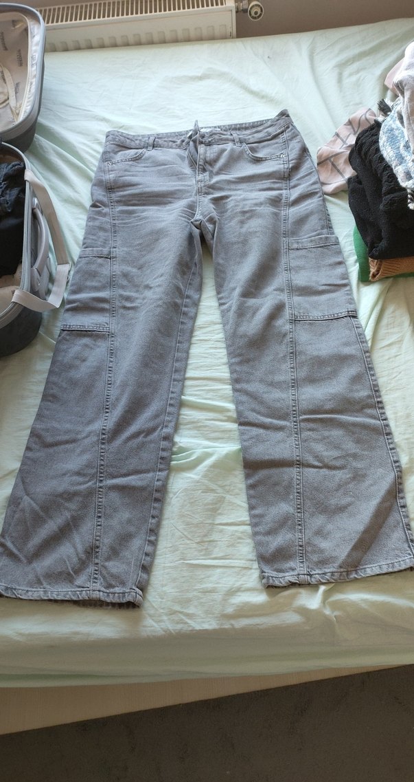 Gri renkli, bol kesim ve normal boyda denim pantolon. Desensiz tasarımıyla gündelik kullanım için rahat ve şık bir görünüm sunar.