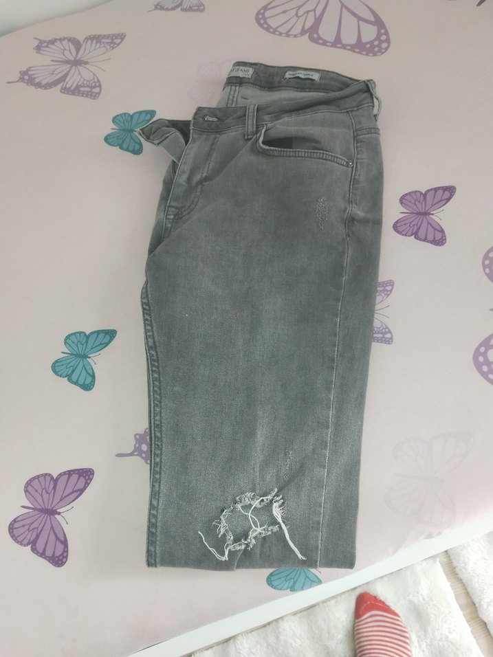 Gri renkte bol kesim, normal boyda erkek denim pantolon. Günlük sokak stiline uygun rahat bir parça.