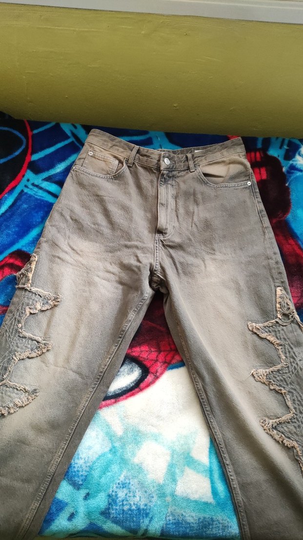 Gri renkte, bol kesim, tokalı detaylı erkek denim pantolon. Grunge punk tarzında, normal midi boyda, günlük kullanım için uygun.