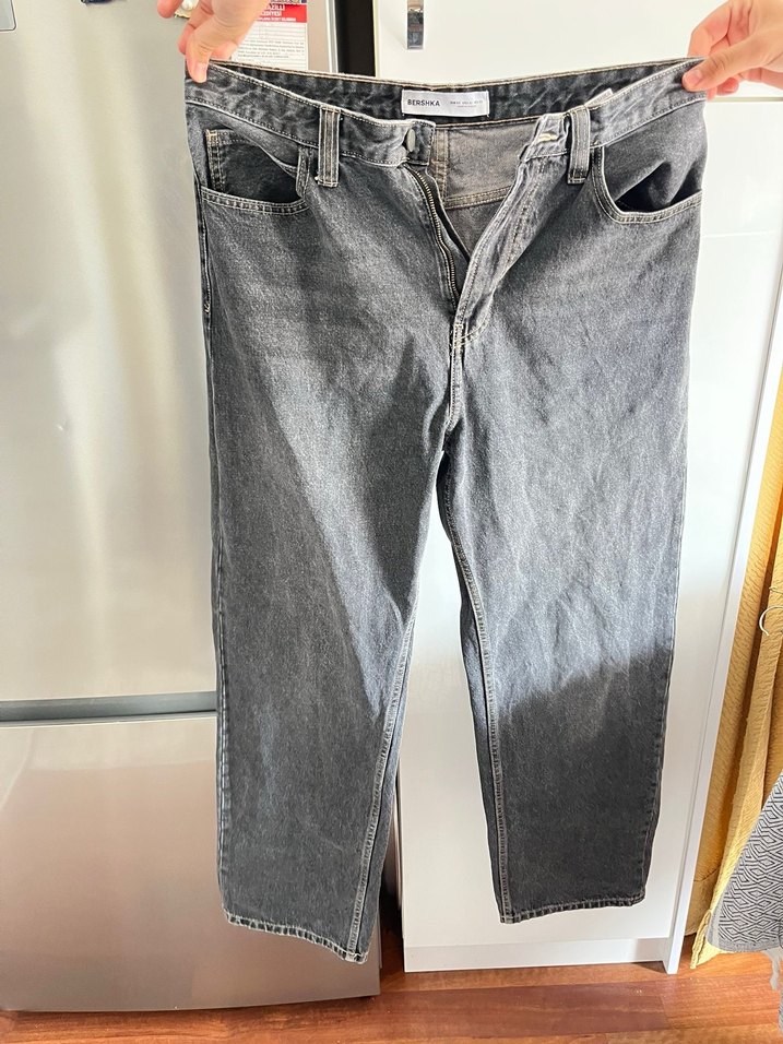 Gri kot pantolon, bol kesim,rahat sokak stili için uygundur. Günlük kullanımda şık ve rahat bir görünüm sunar.