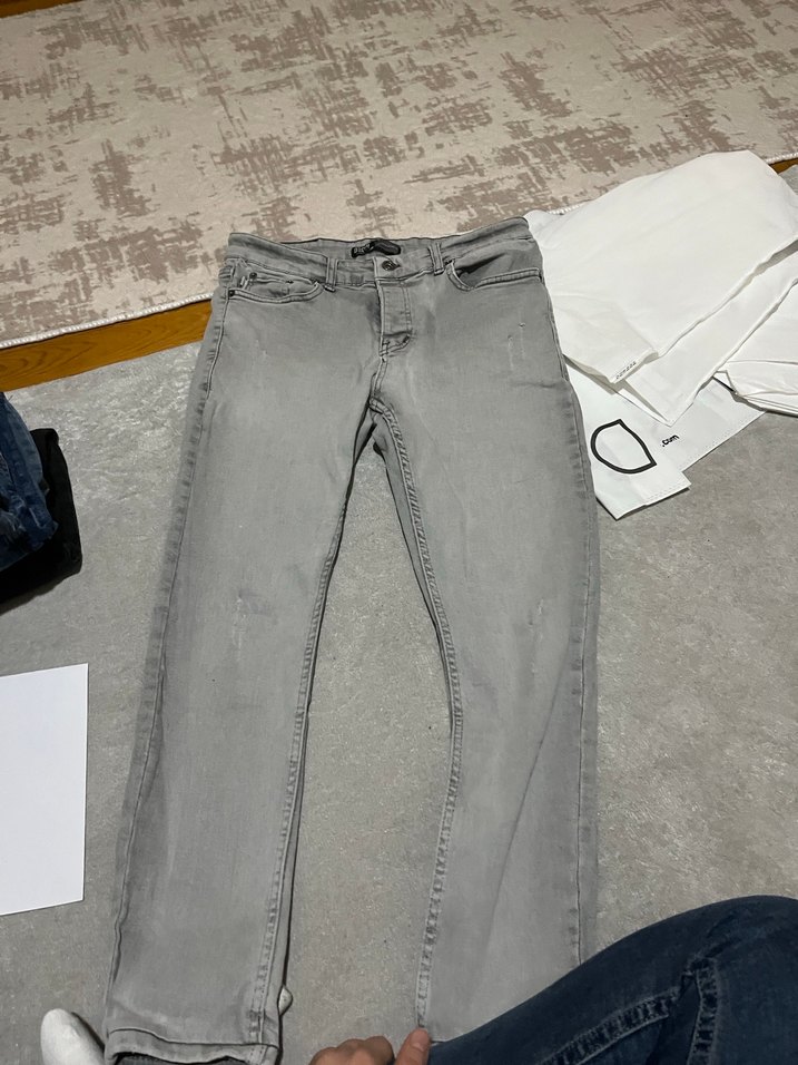 Gri renkte, bol kesim ve tokalı detaylara sahip kot pantolon. Normal boyda, sokak modasına uygun ve gündelik kullanım için ideal. Göründüğü gibi defosu yok