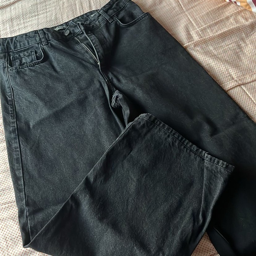 Gri renkte, düğmeli ön kısmı ve normal boyu ile bol kesim kadın denim pantolon. Günlük kullanım için uygun sade ve rahat tarzda.