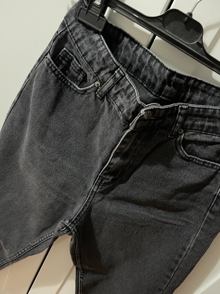 Gri renkte, bol kesim, tokalı detaylı midi boy kadın denim pantolon. Rahat ve günlük kullanıma uygun sokak stili.
