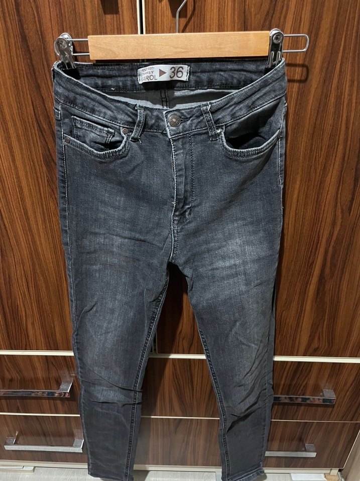 Gri renkte, bol kesim ve normal boyda, denim kumaştan yapılmış kadın pantolonu. Tokalı detayıyla günlük sokak stiline uygundur.