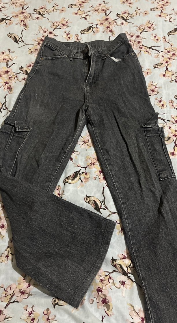 Gri renkte, bol kesim, tokalı detaylara sahip midi uzunlukta kadın denim pantolon. Günlük kullanıma uygun, desensiz tasarım.