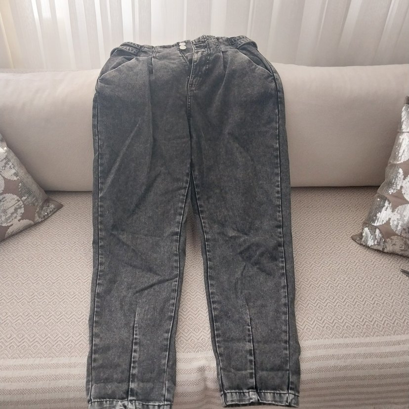 Gri renkte, bol kesim, kemerli kadın denim pantolon. Günlük kullanıma uygun, rahat ve sokak stiline uygun midi boyda.