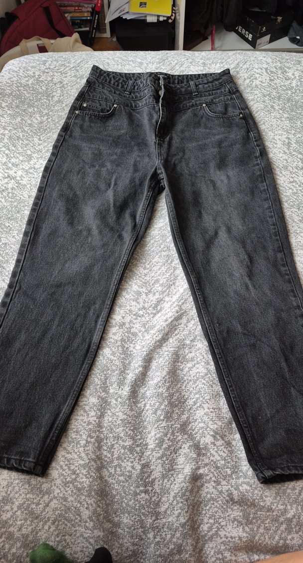 siyah renkte, bol kesim ve normal boyda kadın denim pantolon. Günlük kullanıma uygun, rahat ve şık bir stil sunar.