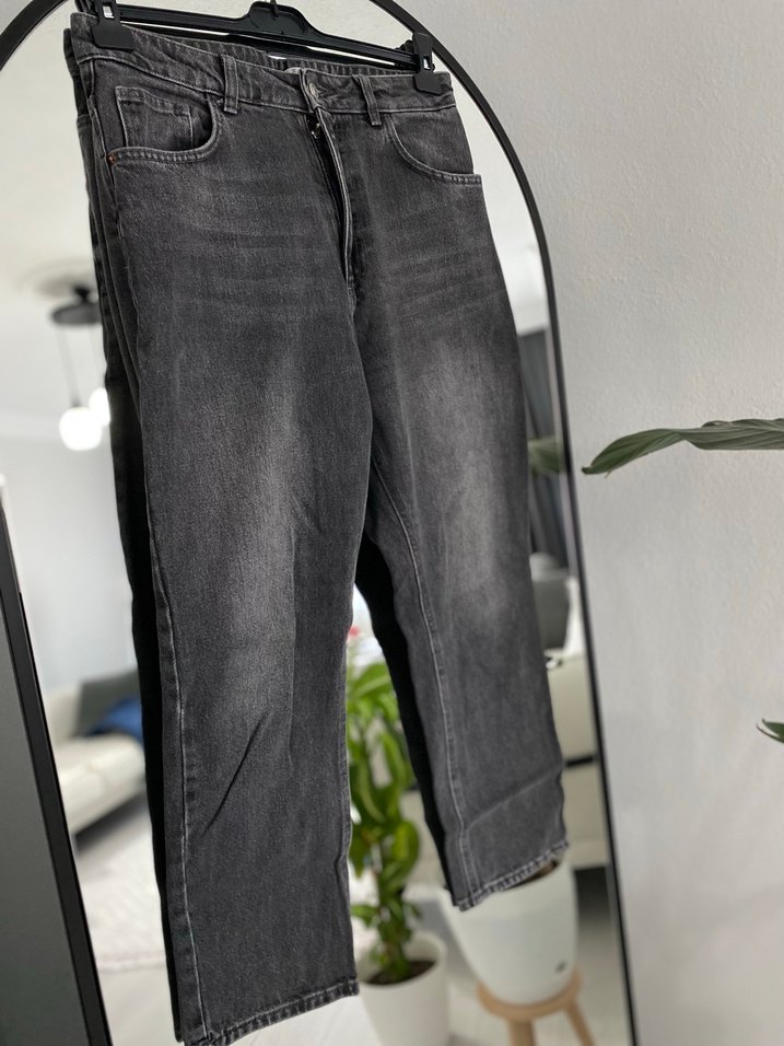 Gri renkte, bol kesim ve normal midi boyda, tokalı detaylı kadın kot pantolon. Günlük ve sokak stili için uygundur.