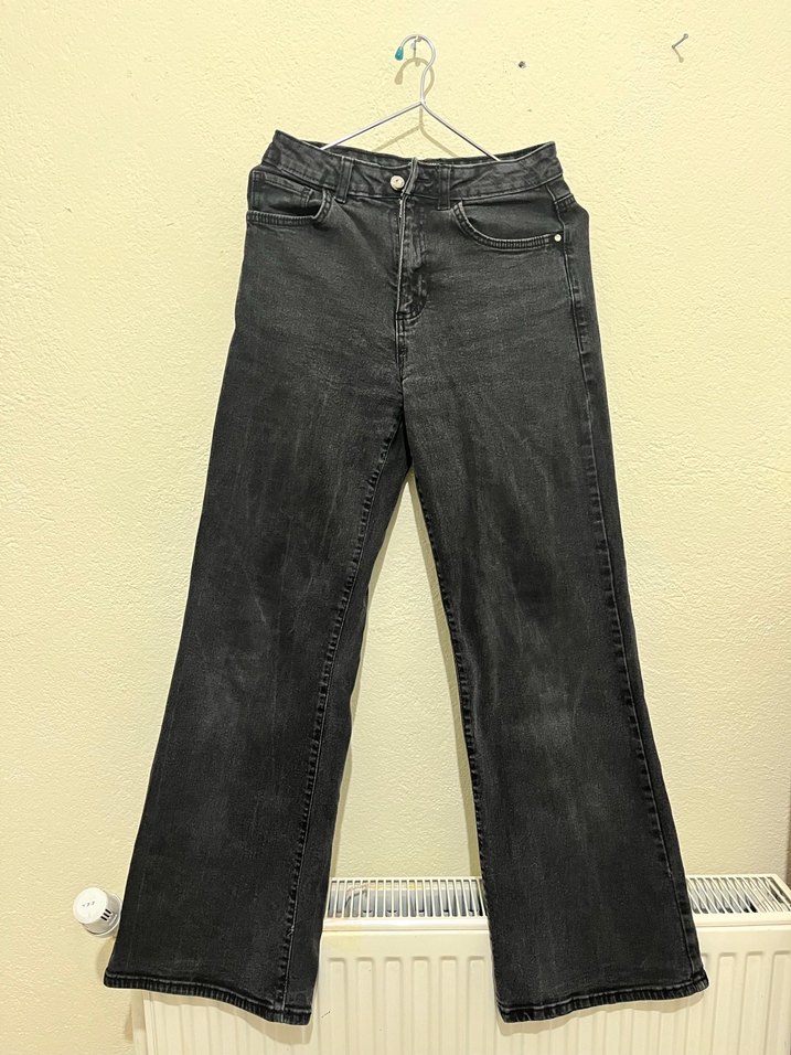 Gri bol kesim midi uzunlukta kot pantolon, rahat ve şık sokak stili için uygun, günlük kullanıma ideal.