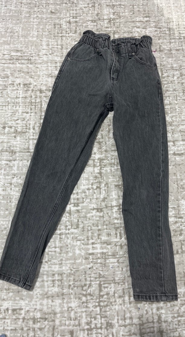 Gri renkli, bol kesim kot pantolon, kemerli bel detayıyla günlük sokak stiline uygundur.