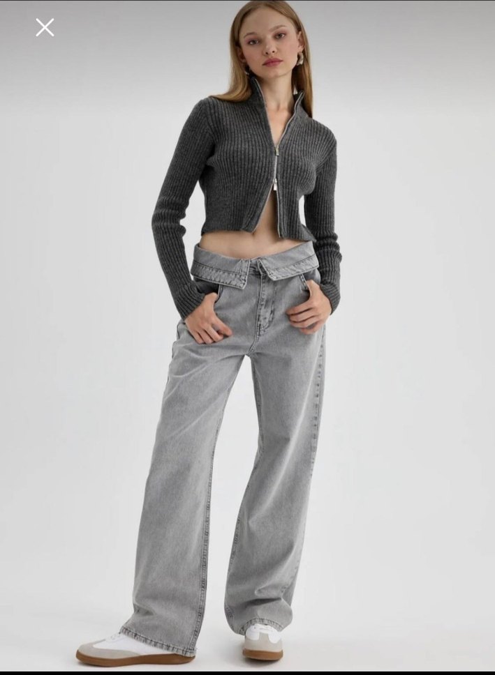 Gri renkte, bol kesim ve kemerli kot pantolon. Midi boyda, desen içermeyen ve günlük kullanıma uygun sokak stili jeans.