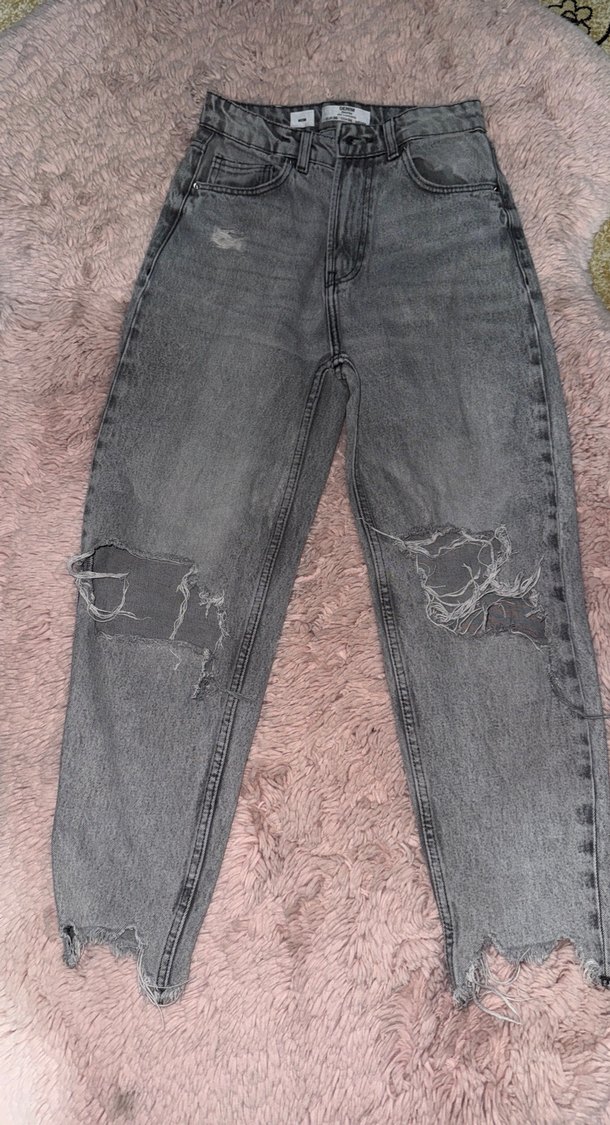 Gri renkte, bol kesim ve yırtık detaylı kadın kot pantolon. Tokalı aksanlara sahip, midi boyda, günlük kullanıma uygun rahat bir model.