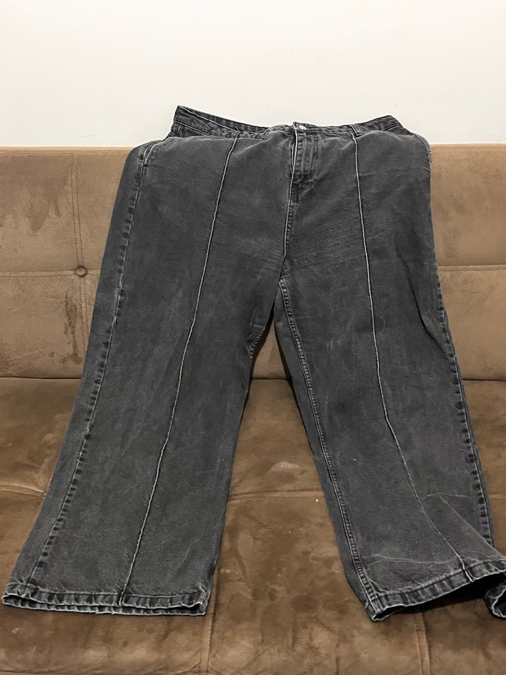 Gri renkte, bol kesim kadın kot pantolon. Denim kumaştan, kemerli ve normal midi boyda, günlük rahat stil için uygundur.