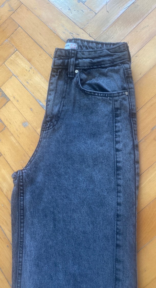 Gri renkte, bol kesim ve yırtmaç detaylı denim kot pantolon. Rahat sokak tarzı desensiz tasarımda düğmesi kopmuştu farklı bir şey dikilmişti isterseniz değiştirebilirsiniz