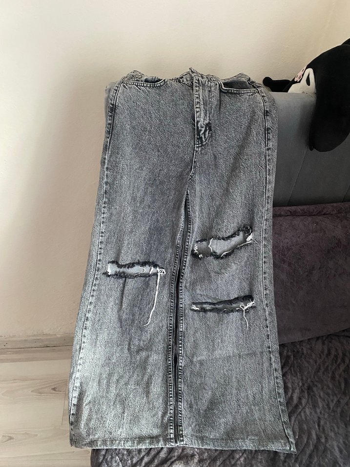 Gri renkte, bol kesim ve kemerli kadın kot pantolonudur. Ön kısmında yırtık detayları bulunur, günlük sokak stili için uygundur.