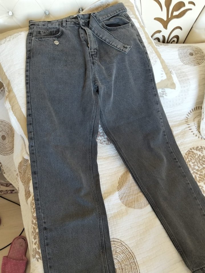 Gri Bol Kesim Kemerli Kadın Kot Pantolon