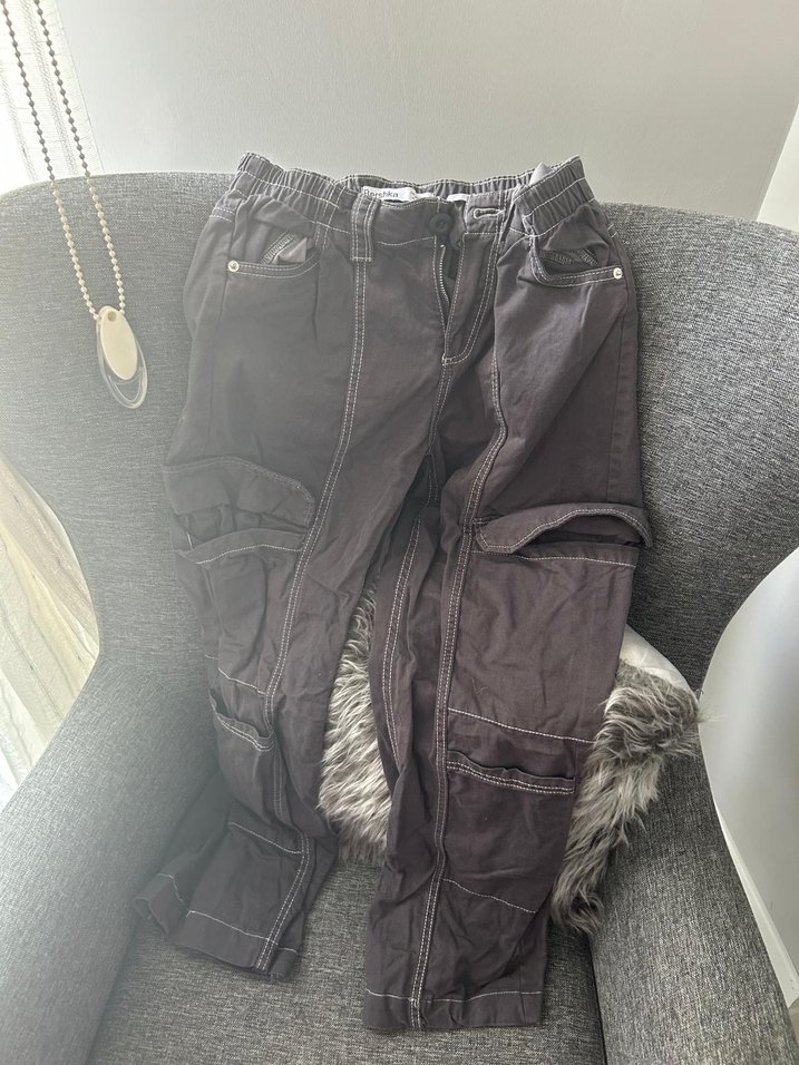 Gri renkli, bol kesim ve kemerli kot pantolon. Normal boyda, desen içermeyen bu pantolon sokak stiline uygun rahat bir görünüm sunar.