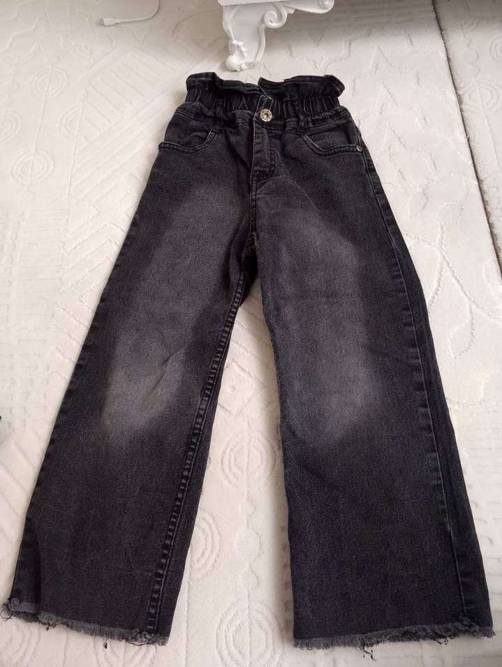 Gri renkli, kemerli bol kesim kız kot pantolon, sade ve rahat bir stil sunar.