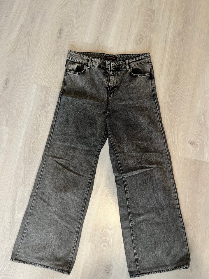 Gri renkte, bol kesim ve midi boy kot pantolon. Günlük kullanım için rahat ve şık bir sokak stili sunar.