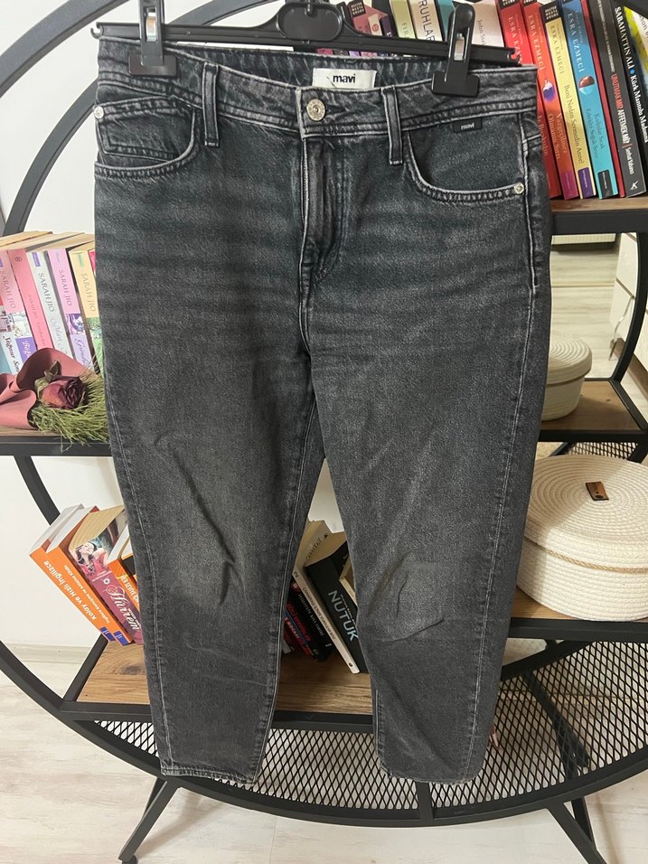 Gri renkte, bol kesim ve normal midi boyda denim pantolon. Tokalı detayıyla gündelik kullanıma uygun, rahat bir stil sunar.