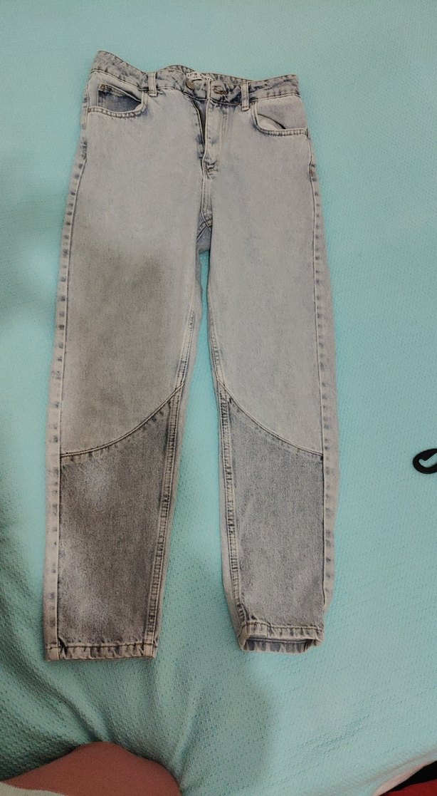 Gri renkte, bol kesim midi uzunlukta kadın kot pantolon. Sokak modasına uygun, rahat ve şık tasarım, günlük kullanım için idealdir. bir kere giyildi.