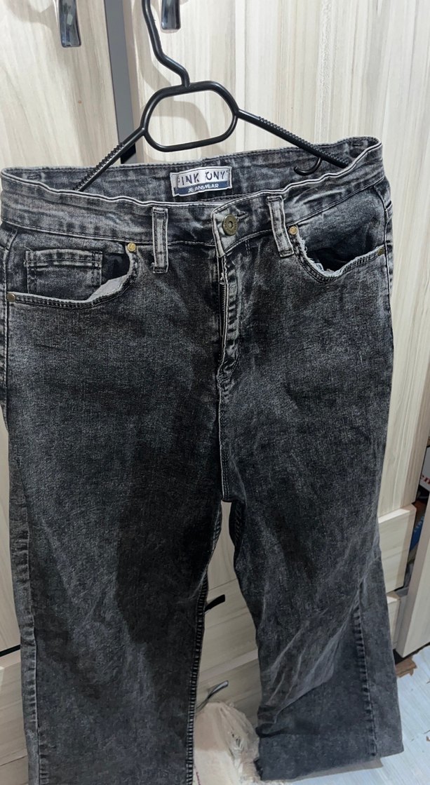 Gri renkte, bol kesim, midi boy kot pantolon. Düğmeli kapama ve sade deseniyle günlük sokak stiline uygun.