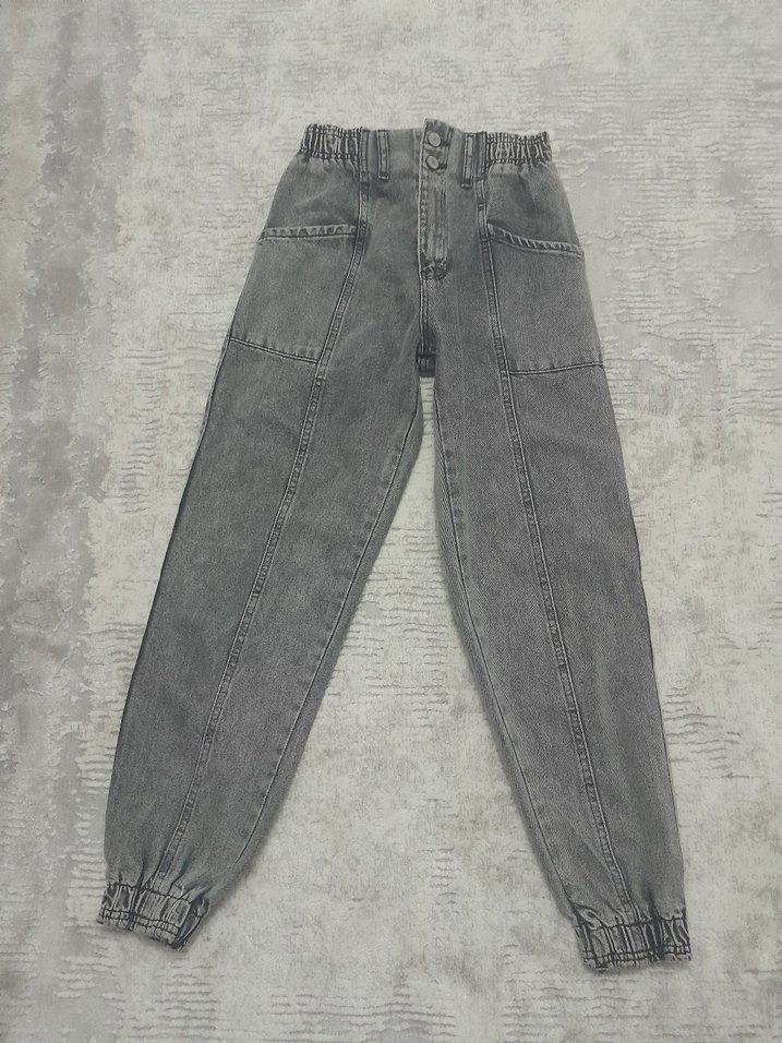 Gri bol kesim kot pantolon, kemerli ve lastikli manşetli. Midi boy, büyük ön cepli, günlük rahat kullanım için uygun.
