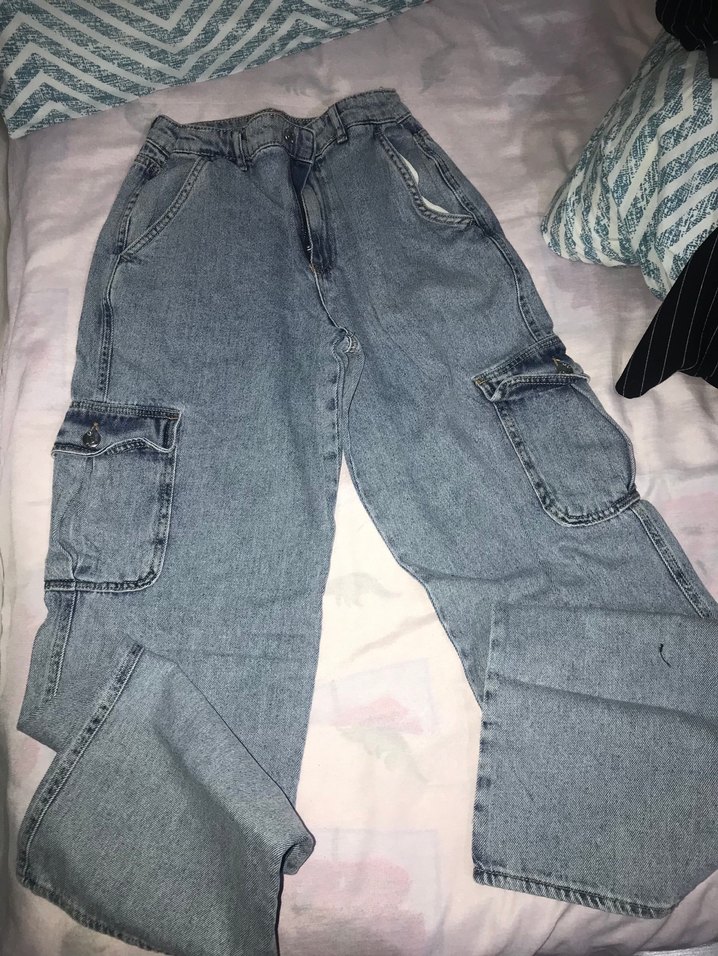 Beli kemerli, bol kesim gri denim pantolon, yan cepleriyle günlük rahat kullanım için uygundur.