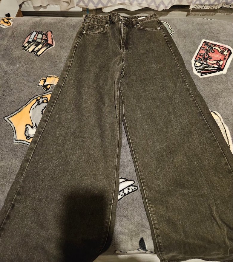 Bu gri kot pantolon bol kesim ve kemerli olup, rahat sokak stili sunar. Midi boyu günlük kullanıma uygundur.