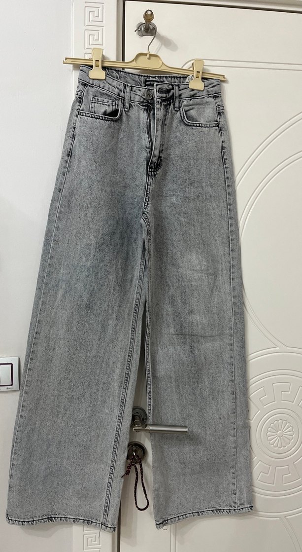 Gri renkte, bel kemerli, bol kesim midi uzunluğunda kot pantolon. Sokak stiline uygun, günlük kullanıma elverişli. Küçük beyaz lekeler dışında hiçbir sorun yoktur