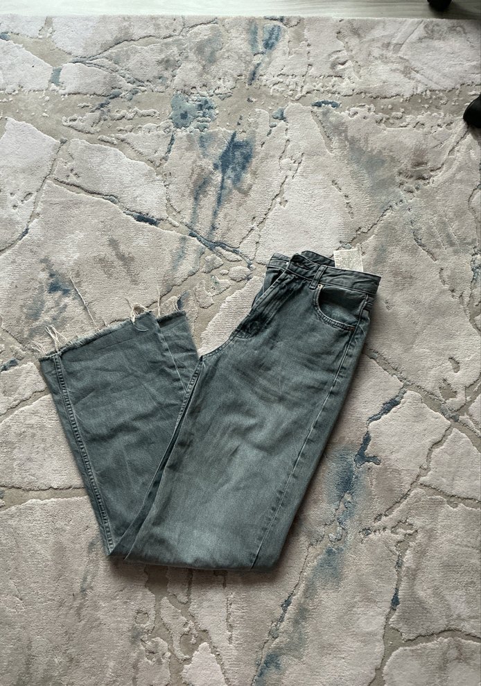 Bol kesim, midi boy gri kot pantolon, desen içermeyen, günlük kullanım için rahat ve şık.