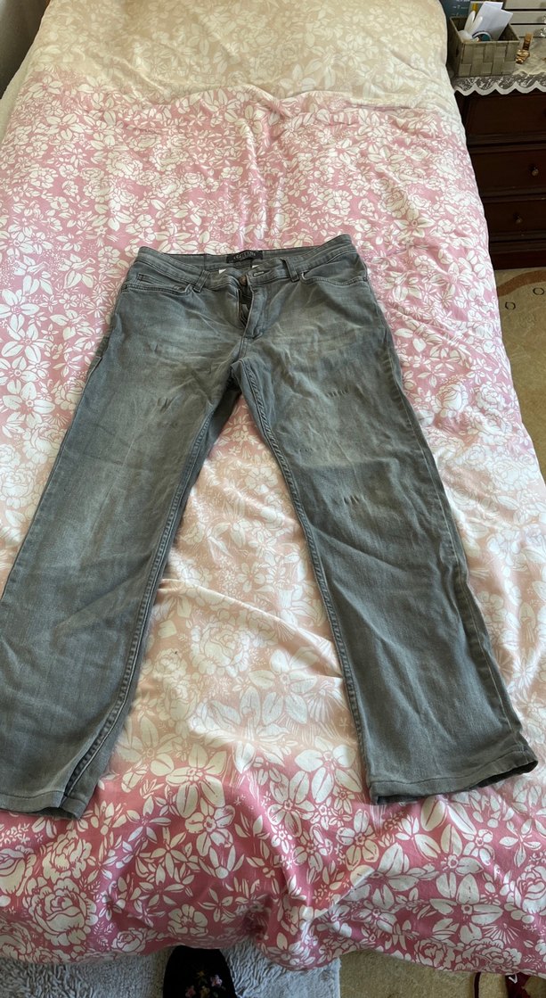 Gri renkte, bol kesim ve midi boy kot pantolon, tokalı detaylıdır. Günlük sokak stili için uygundur.