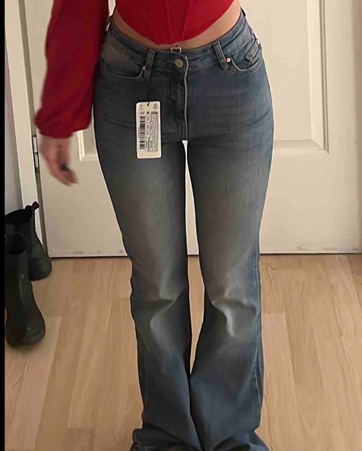 Gri kot pantolon, bol kesim ve kemerli bel detayıyla günlük sokak stiline uygun, normal boyda ve hafif desenlidir.