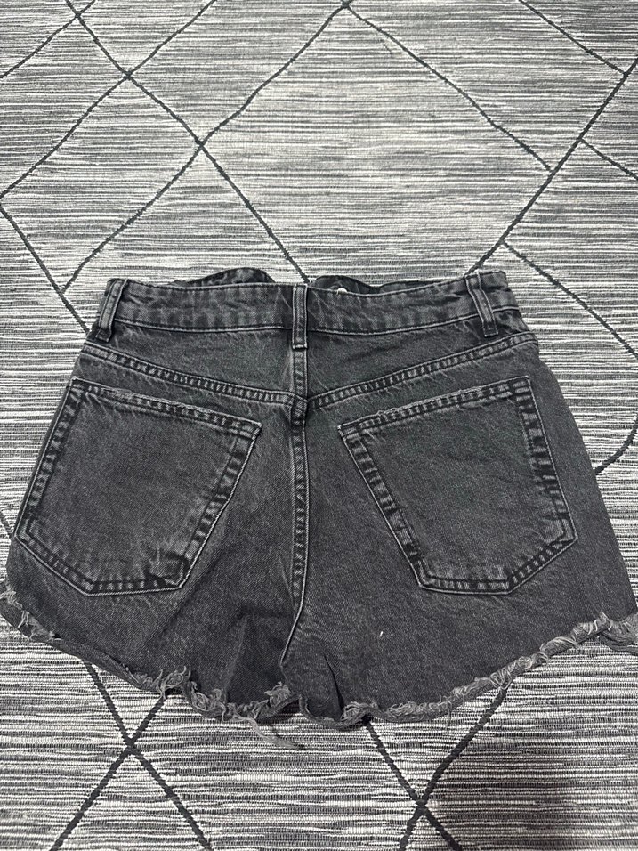 Düğmeli, gri bol kesim mini denim şort. Kenarları hırpalanmış sade tasarım, günlük sokak stiline uygun.