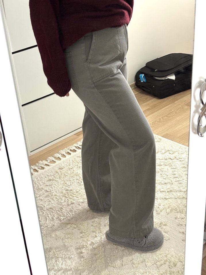 Gri pamuklu, rahat kesim pantolon, günlük kullanım için zahmetsiz şıklık sunar. Trendy casual sokak stili için uygundur. Hiç giyilmedi