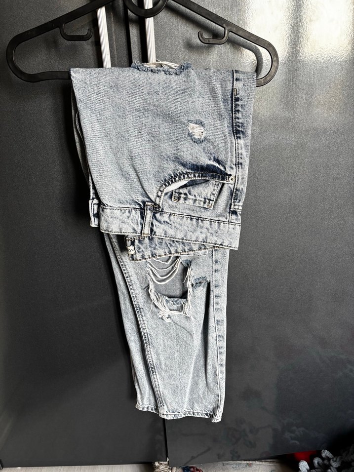 Gri renkli, bol kesim kot pantolon, kemer tokalı ve yırtık detaylıdır. Midi boyda, sokak stiline uygun rahat bir modeldir.