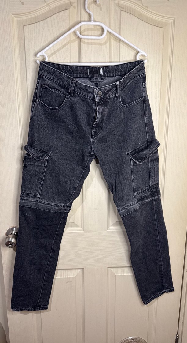 Gri renkte, bol kesim ve normal boy kot pantolon yan cepli, rahat sokak stili için uygundur. Günlük kullanıma uygun. Şorta dönüşebiliyor fermuarları takılıp cıkabiliyor