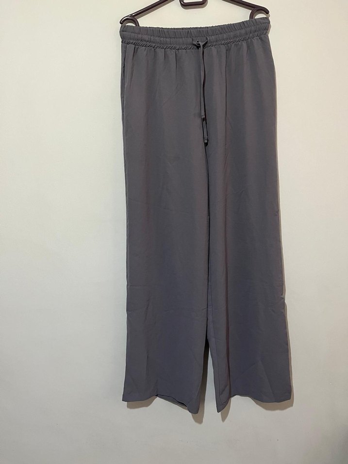 Gri renk, bol kesim ve uzun kumaş pantolon, lastikli bel ve bağcık detaylıdır. Minimalist sokak tarzına uygundur ve günlük kullanım için rahattır.